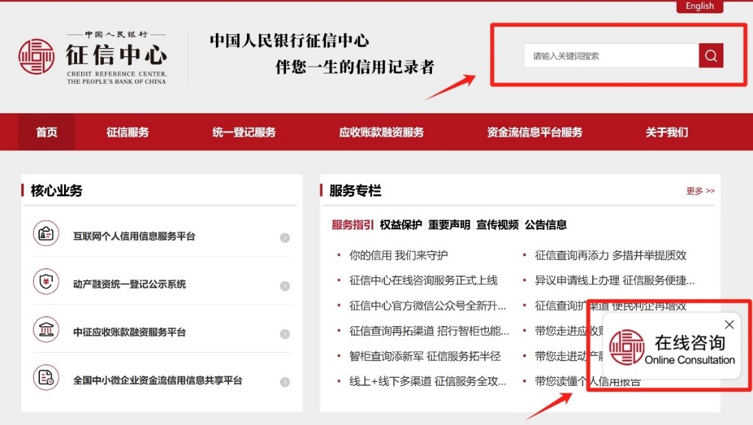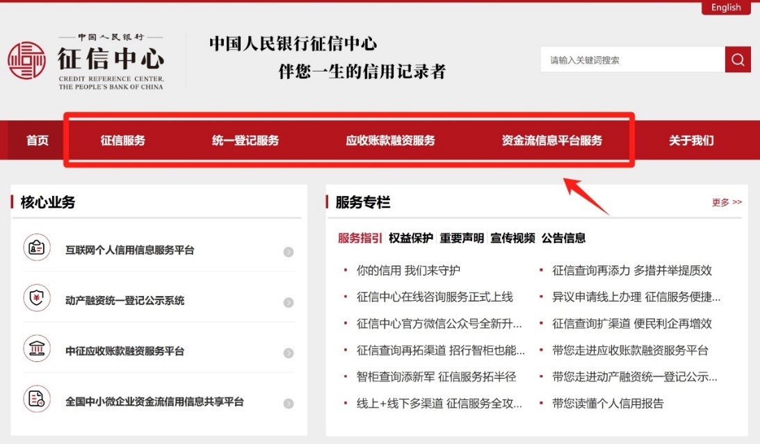 征信中心的核心业务(互联网个人信用信息服务平台、动产融资统一登记公示系统、中征应收账款融资服务平台和全国中小微企业资金流信用信息共享平台)登录入口位于门户网站的醒目位置,便利社会公众一键直达相关业务平台,获取所需服务。